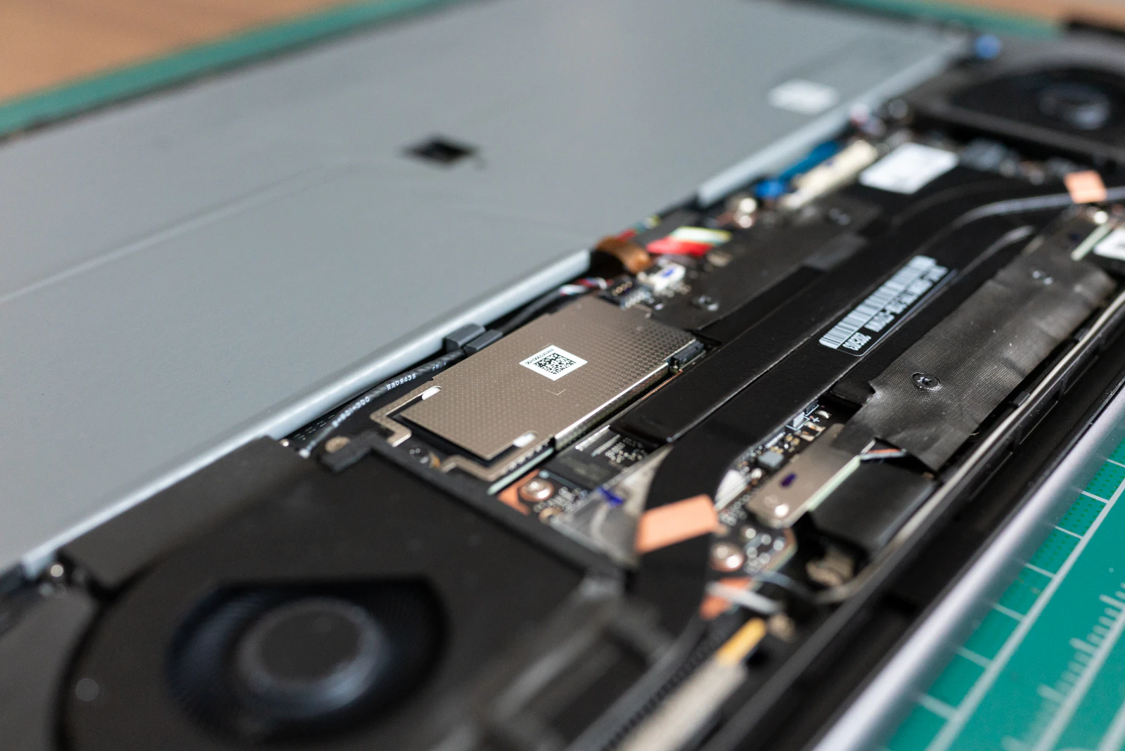 상단에 작은 듀얼 쿨링팬과 히트파이프, 교체 가능한 2242 SSD슬롯이 보인다.